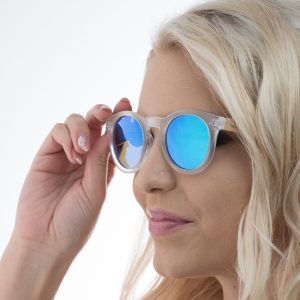 The Del Mar sunglasses are our funkiest design yet. These reflective blue REVO lenses are CAT3, polarized, and provide 100% UV protection. The light seen through these lenses is soft and warm. The transparent white frame and natural bamboo arms make these sunglasses seem even lighter than they are. These sunglasses come with: case, microfiber pouch and cleaning cloth, box.